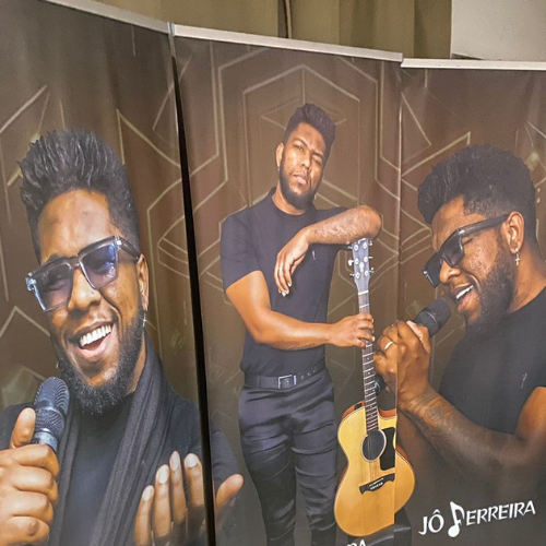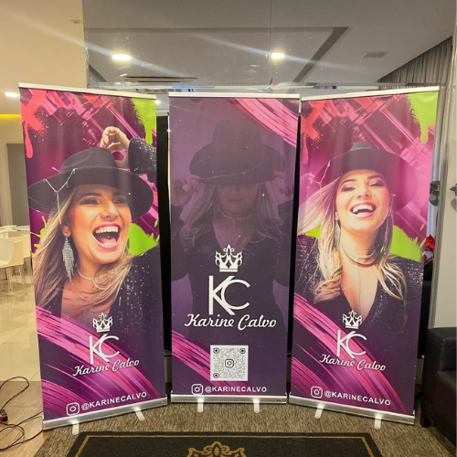 Banners roll-up, displays e materiais promocionais.